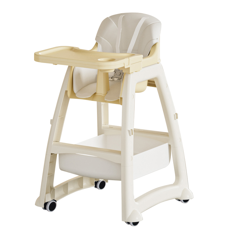 It comes with a removable double tray and there are two positions to adjust the distance between tray and child. In the first layer of the double tray, fruit and food can be placed and in the second layer of children’s toys.