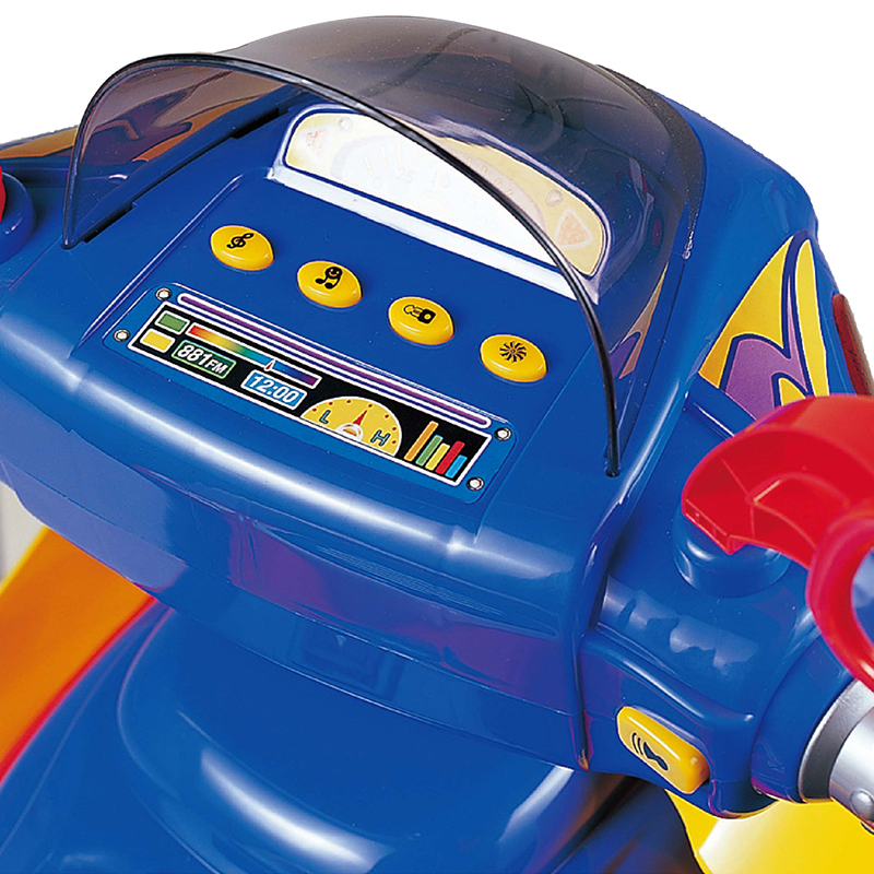 បំពាក់ដោយភ្លើង LED, តន្ត្រី, ឈ្នាន់, ប៊ូតុងទៅមុខ និងថយក្រោយ ម៉ូតូអគ្គិសនីនេះត្រូវបានធ្វើឱ្យប្រសើរឡើងដោយផ្អែកលើរទេះរុញអគ្គិសនីធម្មតា ដែលអាចនាំកុមារនូវបទពិសោធន៍ជិះពិតប្រាកដបំផុត។