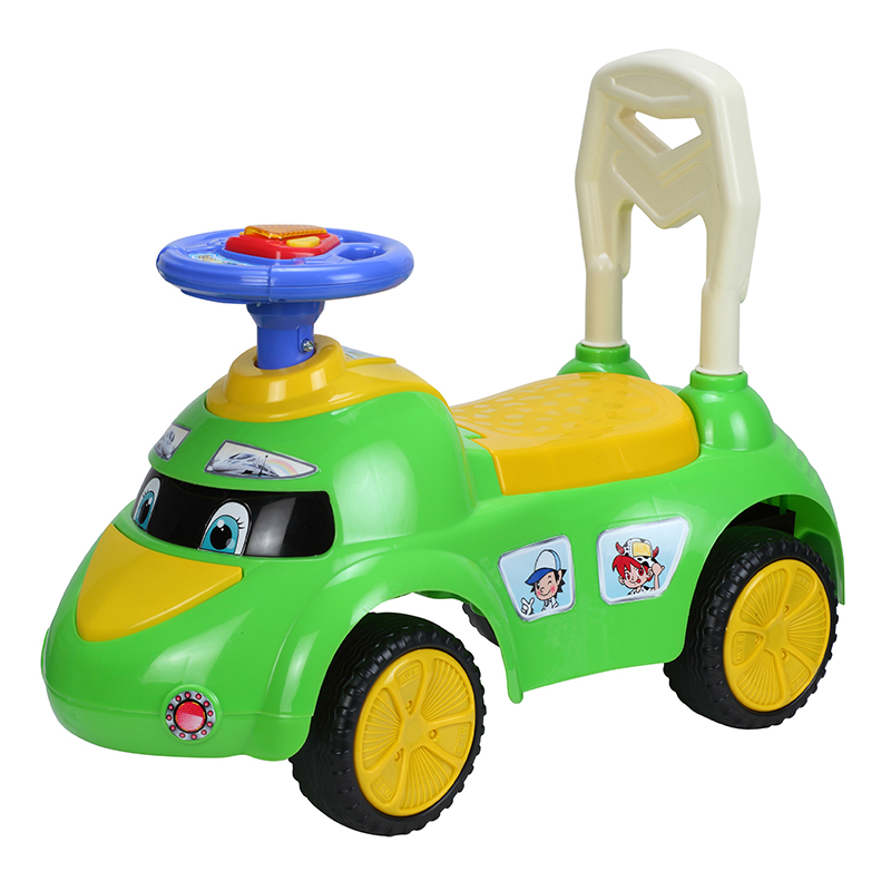 Gari ina magurudumu manne, usukani, mpini wa kusukuma na kiti. Ni saizi inayofaa kwa mtoto wako kutembea na kupanda.